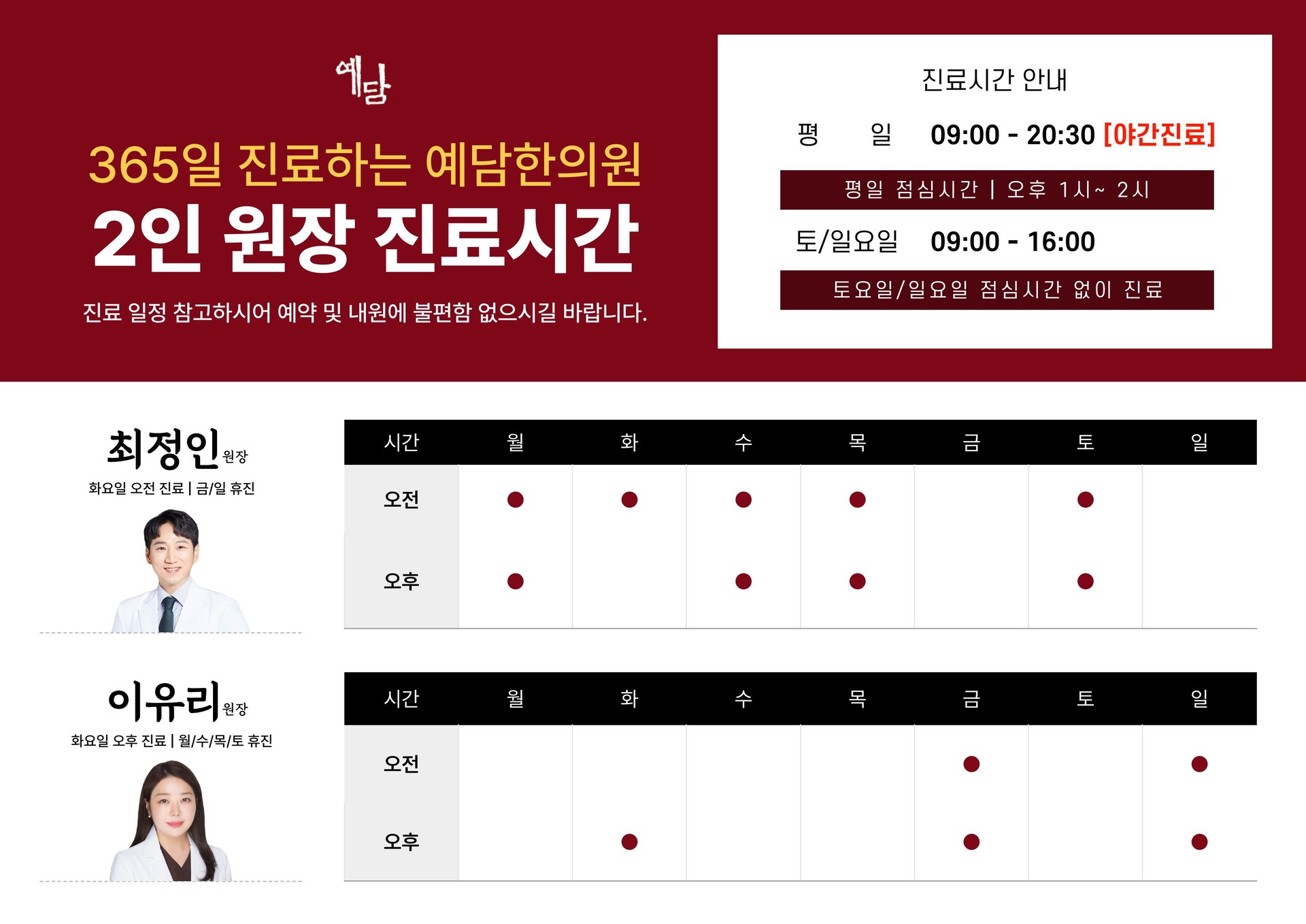 사업자등록번호 : / 대표원장 : / Copyright by 예담한의원 All rights reserved.
